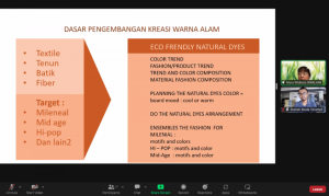 Beliau berbagi pengalaman dan pengetahuan tentang bagaimana tren dan kreasi fashion berbahan warna alam, serta bagaimana menggali kekayaan kain nusantara untuk dipadukan kepada fashion kekinian. “Kreasi Fashion berbahan alami, sesungguhnya bisa dari segi pewarnanya, yaitu menggunakan warna alam, bisa juga dari seratnya menggunakan serat alami, juga bisa kembali ke tradisi yang mencakup banyak aspek yang lebih luas”, ungkapnya.